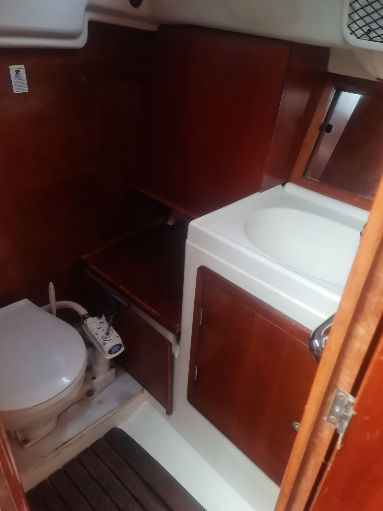 – Puertas entrada a cabina con guías en madera de teca.